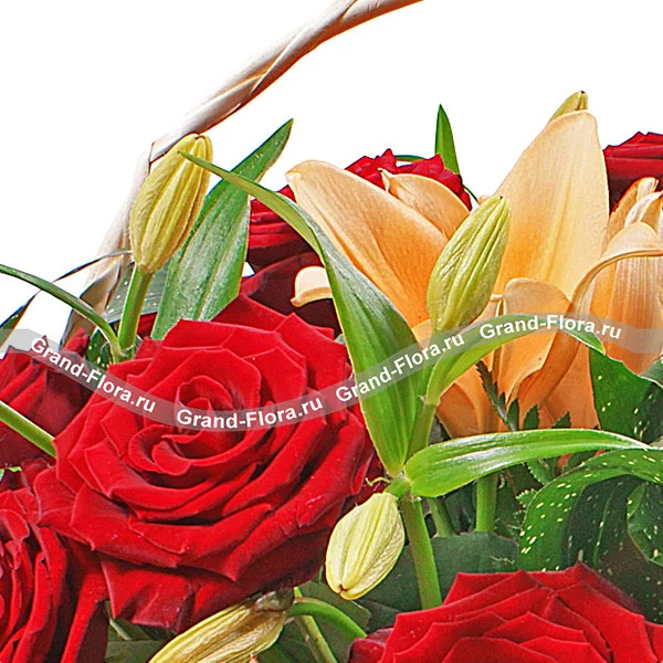 Уменьшенный: роза красная (50 см) - 5 шт., лилия желтая (по сезону. возможна замена на белую) - 1 шт., хризантема одноголовая зеленая - 2 шт., салал, папаратник - 4 шт., оазис, корзина.