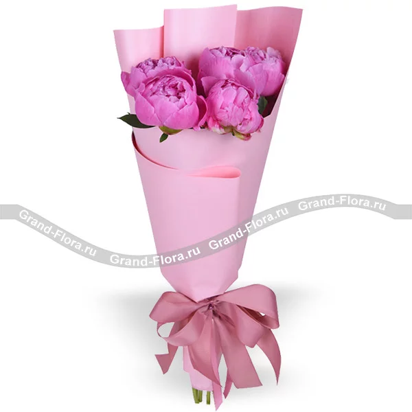 5 пионов: пионы сиреневые- 5 шт., упаковка, лента.