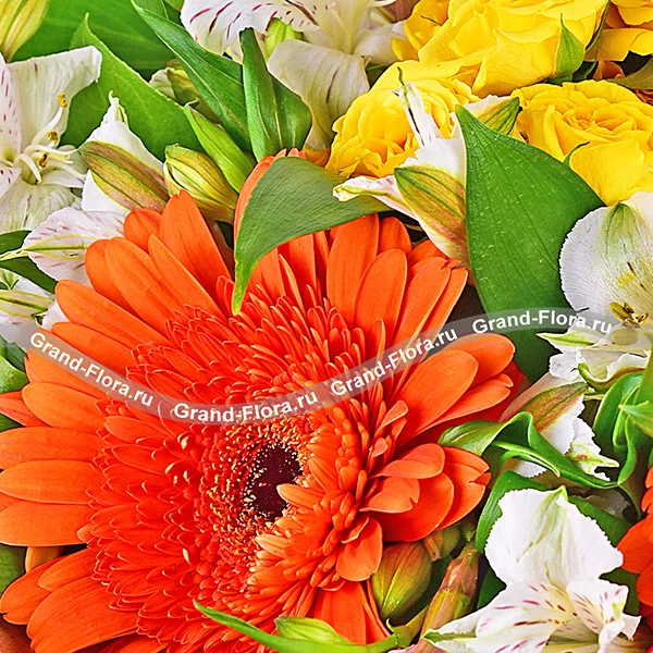 Смешанный выразительный букет из огненно-оранжевых гербер, желтых роз и нежных белых альстромерий великолепно дополнен рускусом. Яркий букет будет отличным дополнением к подарку в день рождения любимой мамы или сестры, а также выражением благодарности дорогой подруге или коллеге